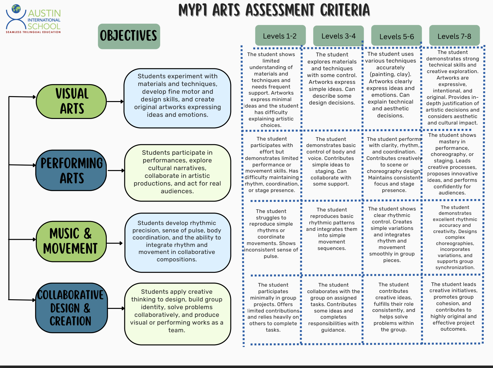 Overall, IB MYP Arts encourages students to express themselves, think creatively, and engage with others through the universal language of the arts.