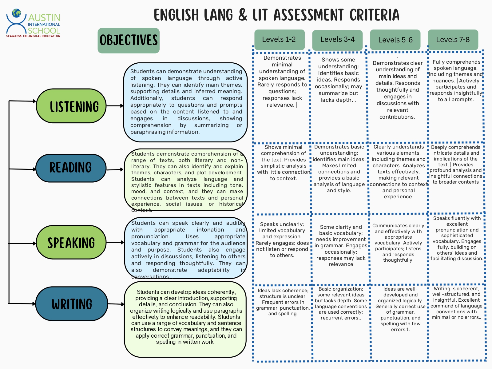 Students engage with diverse genres, including novels, poetry, drama, short stories, articles, media texts, and multimodal works. Learning experiences encourage them to analyze how writers use language, structure, and stylistic choices to convey meaning, and to craft their own texts with purpose and audience in mind. Students also practice giving and receiving feedback to refine their communication skills and build confidence as readers and writers.