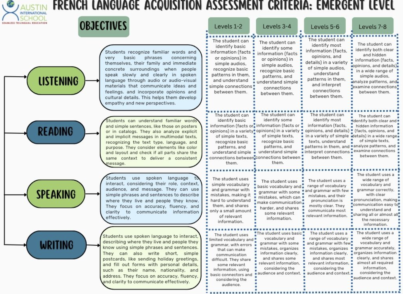 Students recognize familiar words and very basic phrases concerning themselves, their family and immediate concrete surroundings when people speak slowly and clearly in spoken language through audio or audio-visual materials that communicate ideas and feelings. and incorporate opinions and cultural details. This helps them develop empathy and new perspectives.