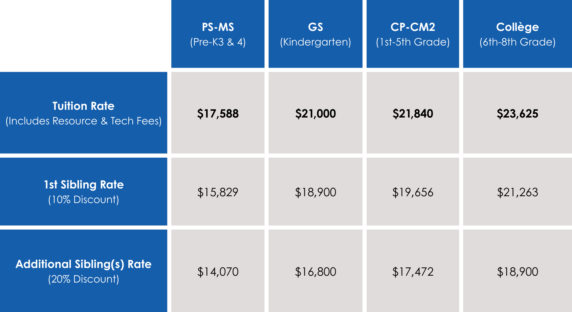 - Extended Care (PS/Pre-K3 - CM2/5th Grade) $3,000 annually